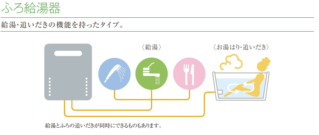 ふろ給湯器は、水栓・蛇口からお湯を出す機能とお風呂のお湯張りを自動で行うことができる追い炊き機能が付いているタイプです。 ふろ給湯器には以下のような特徴があります。