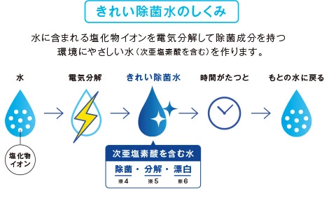 水から自動で生成する「きれい除菌水」で、便器・ノズル・においまで、きれいに洗浄、除菌をしてくれます。また、きれい除菌水は洗剤や薬品を使用しておらず、時間が経つともとの普通の水に戻るため、環境にもやさしく、とても安全です。