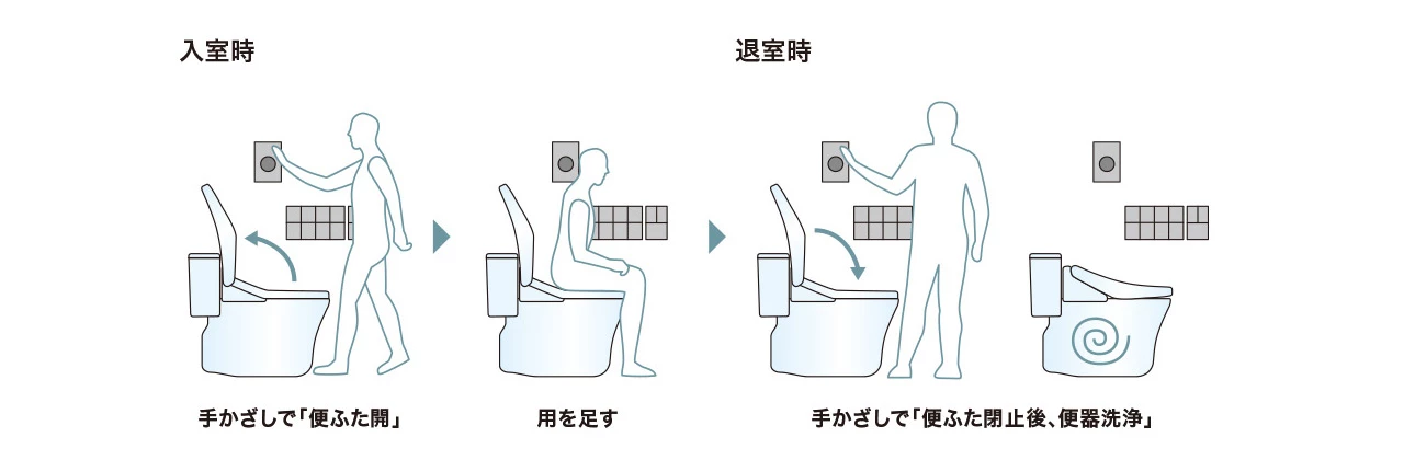 便ふた開/閉止後洗浄リモコンに手をかざすと電動で便ふたが開閉。手を触れないで衛生的に使えます。