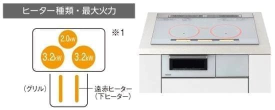 - ※1 2つ以上のヒーターを同時に使用した場合、総消費電力量を超えないようにするため、IHヒーターの火力を自動的に制御します。(火力表示が変わらず火力を制御する場合と、設定火力が下がる場合があります。)