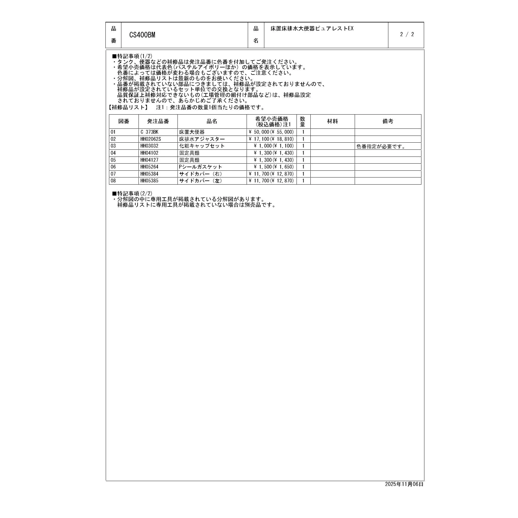 CS400BM 床置床排水大便器ピュアレストEX分解図