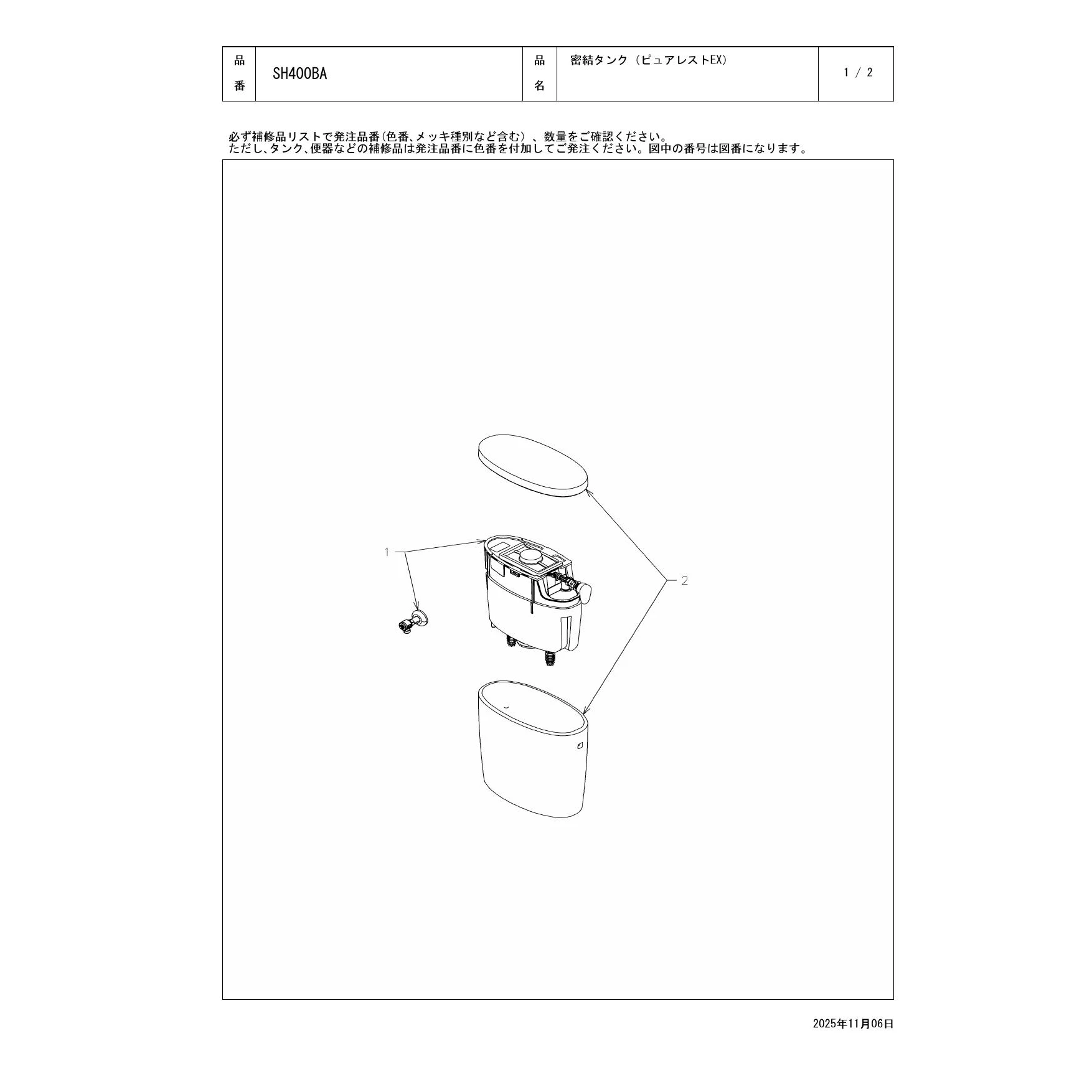 SH400BA 密結タンク(ピュアレストEX)取扱説明書